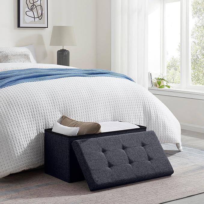 Ornavo Home Foldable Tufted Linen Large Storage Ottoman Bench Foot Rest Stool/Seat - 15" x 30" x 15" (Black)