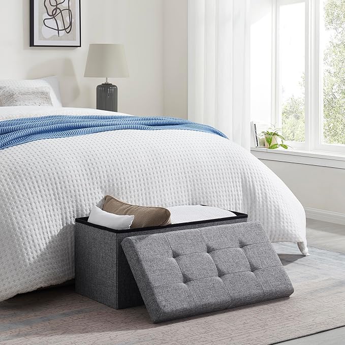 Ornavo Home Foldable Tufted Linen Large Storage Ottoman Bench Foot Rest Stool/Seat - 15" x 30" x 15" (Grey)
