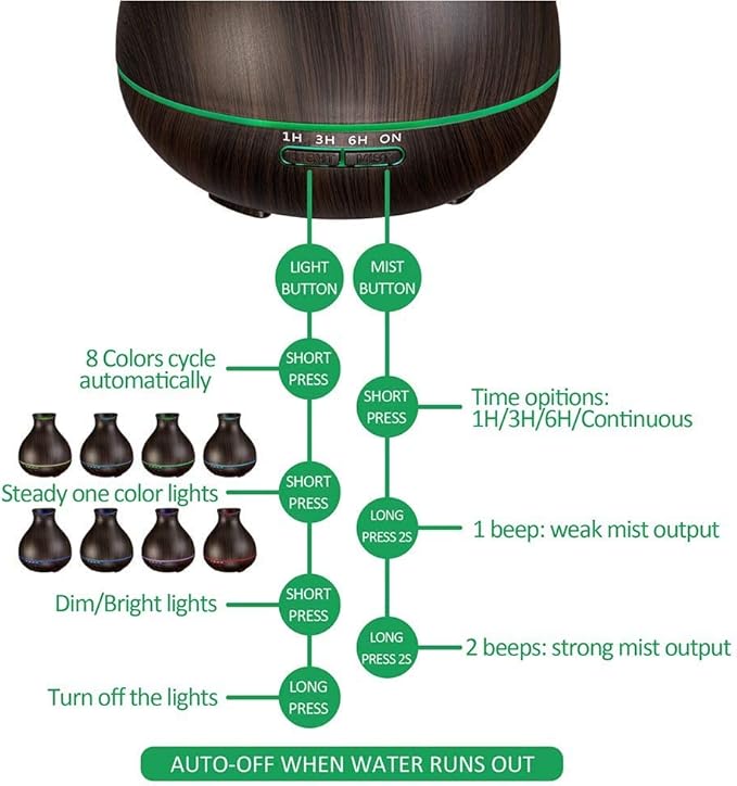 • EXCELLENT SAFETY --It has a timer setting and spray control, with an automatic extinguish function without water. You can continue to use this aromatherapy diffuser at night without worrying about overheating as it has a waterless auto shut-off function to ensure the safety of you and your family. You can also change the light according to your preference by choosing different light modes and timer setting. The three-time setting for option: 1/3/6H timer.