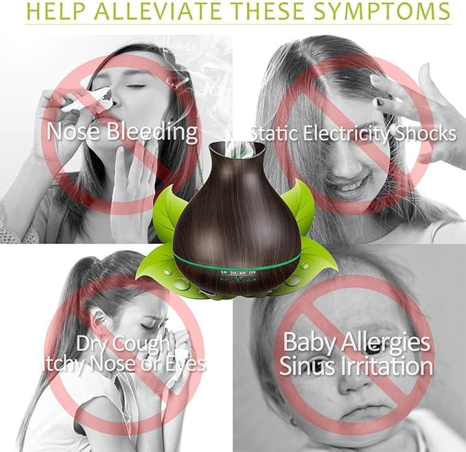 • REDUCE DRY CLIMATE IN WINTER: This aromatherapy diffuser helps to alleviate winter dryness by increasing air humidity. It improves breathing and sleep and reduces static shock in dry climates. Some essential oils can produce a healing effect that relieves your sinuses and can help you breathe better when you use an air conditioner. A great gift for yourself, parents, friends, and partners.