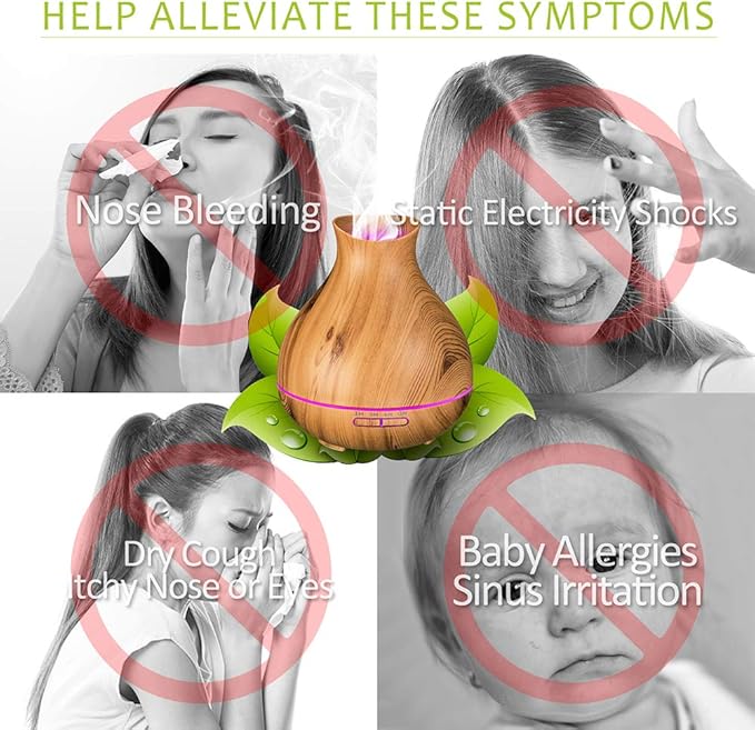 • REDUCE DRY CLIMATE IN WINTER: This aromatherapy diffuser helps to alleviate winter dryness by increasing air humidity. It improves breathing and sleep and reduces static shock in dry climates. Some essential oils can produce a healing effect that relieves your sinuses and can help you breathe better when you use an air conditioner. A great gift for yourself, parents, friends, and partners.