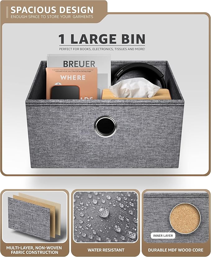 • SMART & STYLISH DESIGN — Sleek compact storage — Made with strong steel frame and durable MDF wood top with smooth black finish — Charcoal gray drawers made of breathable, non-woven fabric — Wipe clean — Minimal assembly required — Hardware and instructions INCLUDED — Measures approximately 15.75” L x 15.75” W x 18.37” H