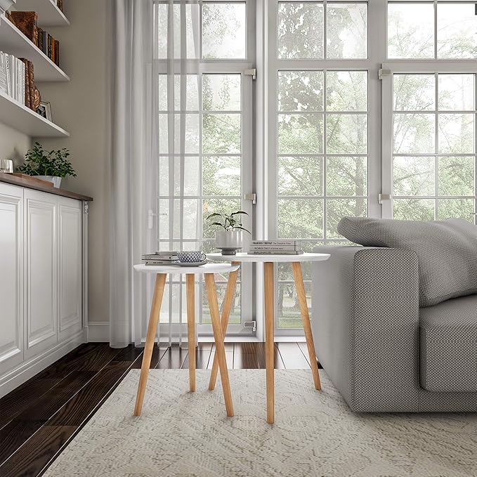Nesting Side Tables - Set of 2 Round End Tables for Living Room, Bedroom, or Home Office - Accent Table Set - Mid-Century Modern Living Room Furniture by Lavish Home (White/Natural)