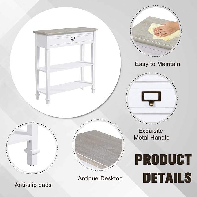 • Ample Storage Space: The console table features 2 shelves and 1 drawer that provide you spacious storage. You can put some decorations like flowers, photos, books or other daily items on the shelves. The drawer provide additional space for magazines or some small things.