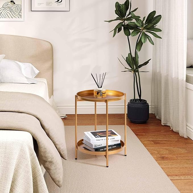 HollyHOME 2-Tier Round Gold Side Table, Outdoor Small Folding Accent Stand with Removable Tray, Anti-Rust Metal Asional Table for Balcony Patio Living Room, Nightstand for Bedroom(Gold)