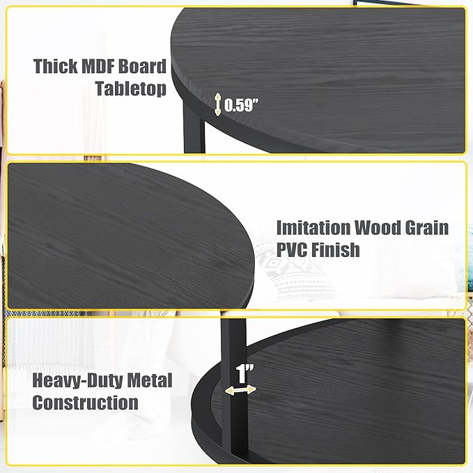 • Imitation Wood Grain Surface---The black wood grain PVC veneer finish has the look of being elegant and simple, giving it texture and a rustic homey appeal for our coffee table. Also, this round table is scratch-resistant, waterproof and easy to clean. No paint was needed, green non-toxic and Eco-friendly.