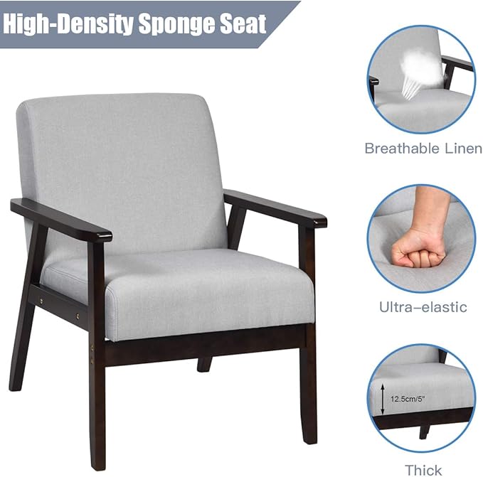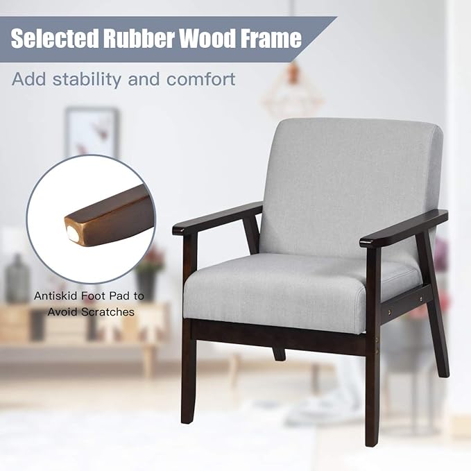 Giantex Mid-Century Modern Accent Chair, Retro Fabric Armchair, Solid Hardwood Made, Upholstered Linen Lounge Arm Chair for Living Room (1, Light Grey)