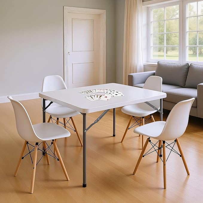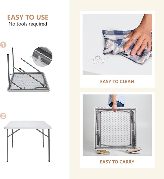 • 【Solid Tabletop & Easy to Clean】-- Made of heavy duty blow molded High Density Polyethylene(HDPE), 20% thicker and stronger than those fragile hollow tables. The resin surface is waterproof, scratch and impact resistant, allowing this square folding card table easy to clean and ideal for indoor or outdoor use. The soft beveled radius edge is also designed for comfort