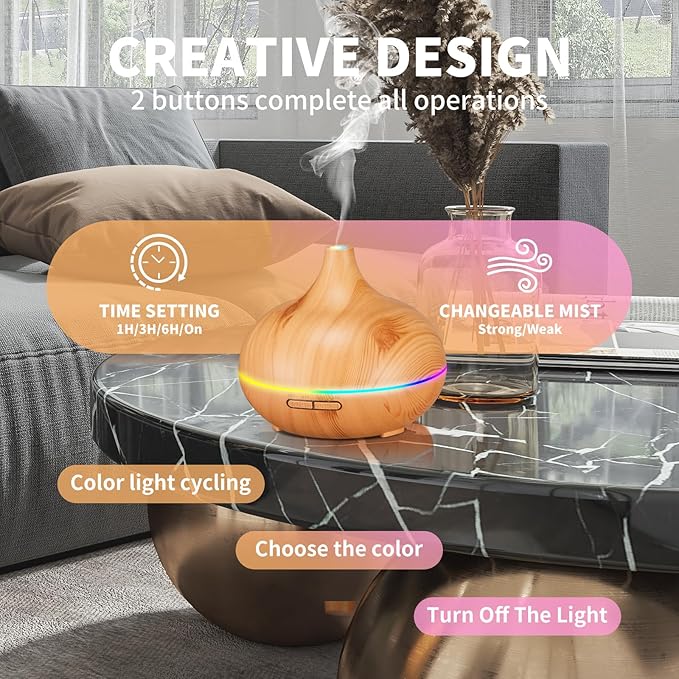 • Long time working essential oil diffusers: This Fragrance essential Oil Diffuser comes with 4 built-in timer setting modes: 1 / 3 / 6 Hours/ Continuity. You only need pour enough water and drops essential oils to enjoy the taste of nature. Companied by the aroma diffuser, you can work, study, read, do exercise etc. this essential oil diffuser with oils set is your large room diffuser.
