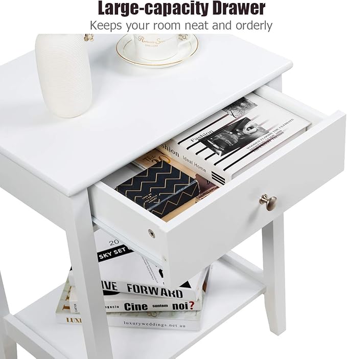 • 〖Ample Storage Space〗Including 1 drawer with a metal handle and 1 lower storage shelf, this 2-tier nightstand is perfect for storing bedside essentials and sundries. Spacious table top allows you to place cups, glasses, family photos, lamps and more. Plus, the drawer is designed for stashing your private items in order.