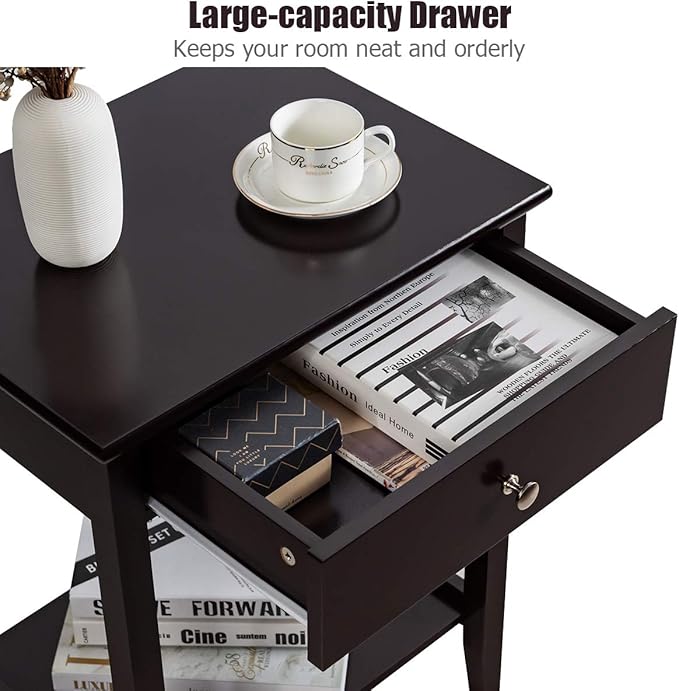 Giantex Nightstand Wooden 2-Tier Couch Sofa Side Table with Drawer, Storage Shelf, Solid Wood Legs,Mufti-Functional Home Furniture for Living Room Bedroom Study Room End Table (1, Brown)