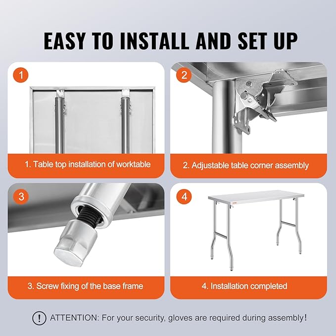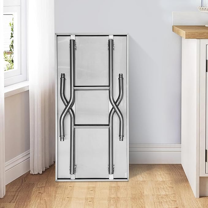 • ATTENTION: For your security, gloves are required during assembly! 【STURDY STRUCTURE】- Material: stainless steel; Table leg diameter: 1.5 inches; The 21 gauge type stainless steel top is supported by legs with a 1.5-inch diameter and thickened folding hinge(3 mm in thickness), effectively keeping the table stable during use. The smooth surface allows for easier cleaning and less complicated maintenance.