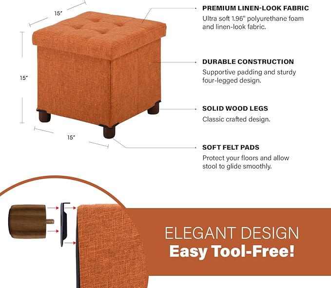 15 Inch Storage Ottoman with Wooden Legs - Cube Foot Rest Stool, Square Footstool, Comfortable Seat with Lid, Foldable Fabric Ottoman, Space-Saving Orange