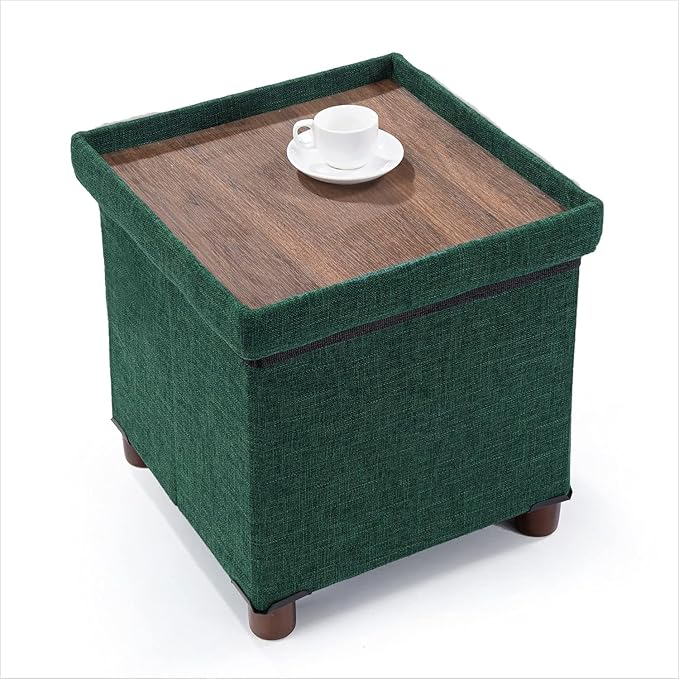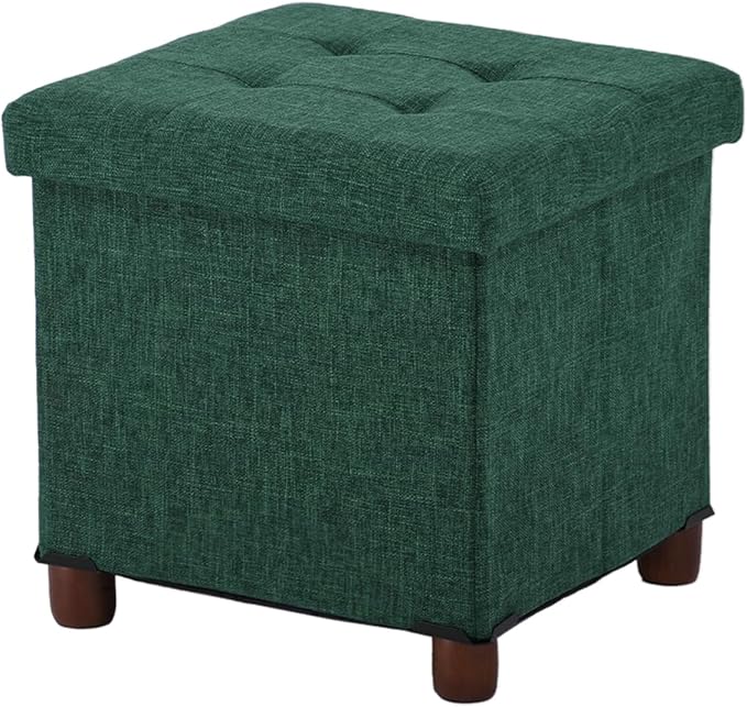 15 Inches Storage Ottoman with Wooden Legs, Cube Foot Rest Stool/Square Footstool Storage for Living Room, Foldable Fabric Ottoman, Comfortable Seat with Lid, Space-Saving Green