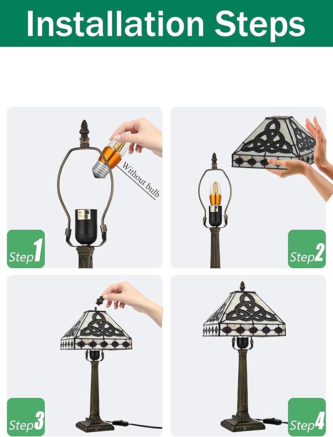 • Stained Glass Irish Style Table Lamp Home Decor :(We do not provide free light bulbs) Lamp shade wide 8.50 inch height 18inch (45cm), Zinc Base 0.85KG wide 6 Inch (15CM) ,UL listed, Switch: Online-on/off. 12 Inch far away from base, and 48 Inch far away from Plug , Finish: Bronze color and hand made stained glass lampshade, Assemble is Easy,LED Bulb Included, E26 2700K G45 LED Bulb 1PCS, 4-8W Warm White Light Will Be Better.The decoration effect is very good, Light not very bright, but no problem for reading.