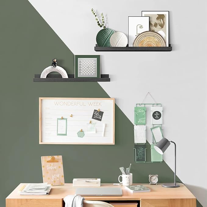 • 【Perfect solution for your walls】The picture ledge shelf is SAME SIZE as each other (L 23.1" x D 4.5" x H 2.2") and is such an easy way to display photos without making lots of holes in your walls. The wall shelves are crafted from Paulownia wood which are lightweight yet proportionately strong, sustainable real wood. They come fully assembled and all mounting hardware is included in the package.