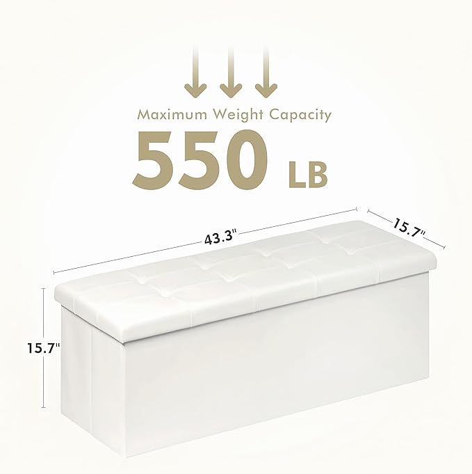 • SECRET HIDDEN STORAGE: Storage ottoman bench with foldable design is perfect for small spaces, if you need an item with storage, then this storage stool will be a good choice, when not in use can be folded up does not take up space. When set up, the foot rest stool storage ottoman measures 43.3”L x 15”W x 15”H Max weight capacity is 550LBS