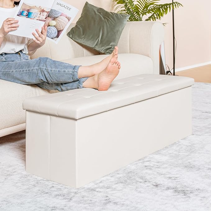 PINPLUS Folding Storage Ottoman Bench with Tray, 43.3inches Faux Leather Long Storage Chest Footrest Seat, Coffee Table, Foot of Bed Storage Bench for Living Room Bedroom, Beige