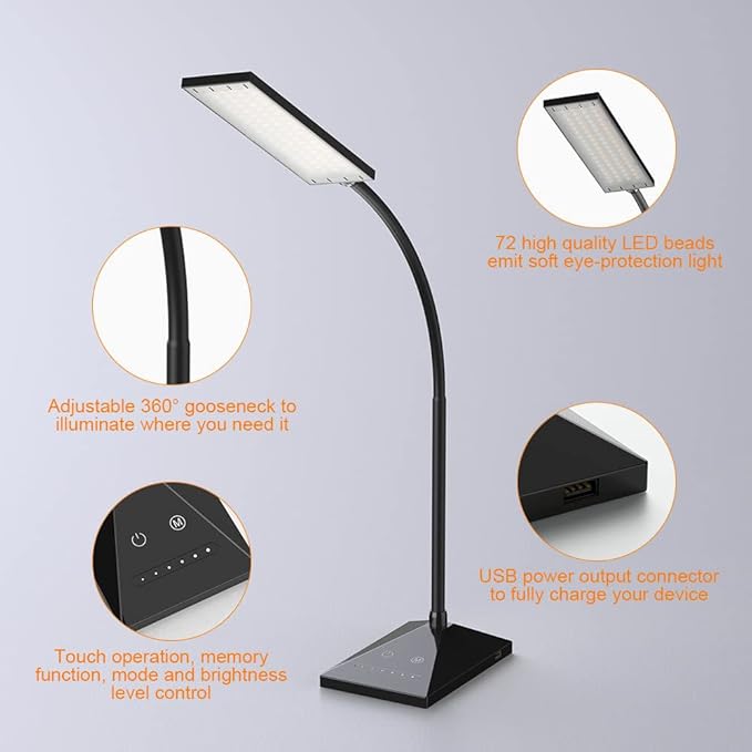 Vansuny LED Desk Lamp with USB Charging Port, Eye-Caring, 5 Color Modes,6 Brightness Levels, Touch Control, Flexible Gooseneck, Memory Function for Dorm Office Work Bedroom (12W,Black)