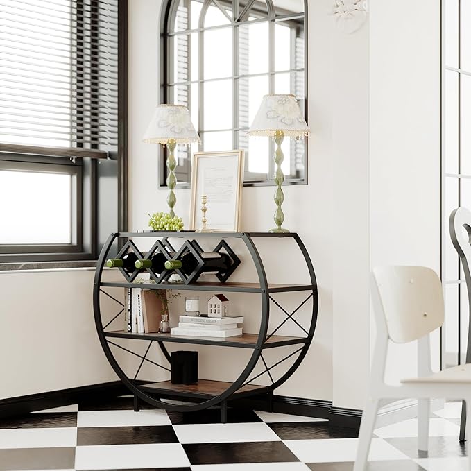 Demilune Console Table Industrial Entryway Table with 4-Tier Open Storage Shelf Wood and Metal Christmas Sofa Table with Wine Rack for Living Room Hallway Display Vintage Rustic Brown