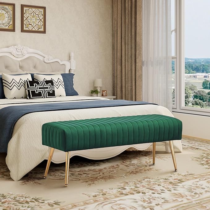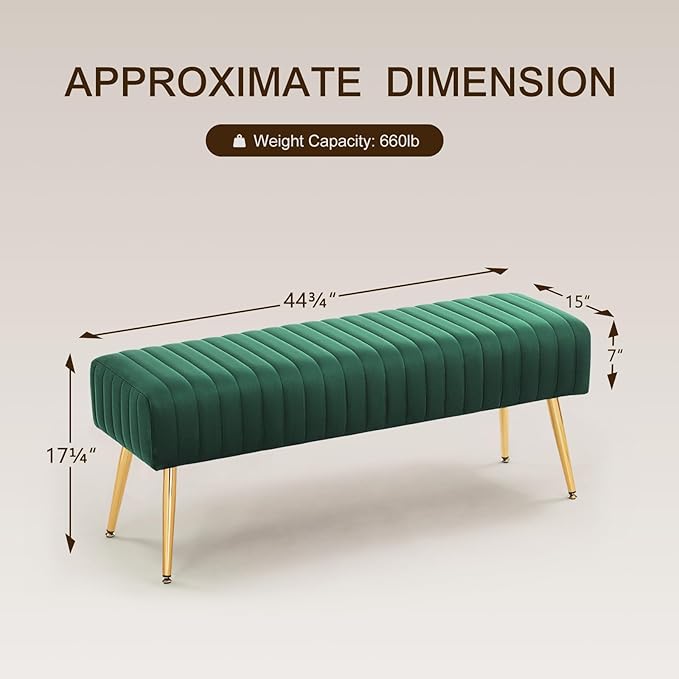 Furnimart 44 Inch Green Velvet Bench Ottoman Comfortable Footrest Stool Table Bench Dining Bench Tufting Bench Indoor Bench with Gold Legs for Living Room Bedroom Entryway (Velvet-Green)