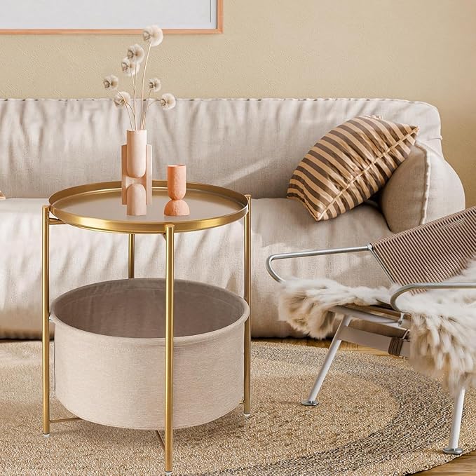 danpinera Round Side Table with Fabric Storage Basket, Metal Side Small Bedside Table Nightstand with Removable Tray Top for Living Room, Bedroom, Nursery, Laundry, Gold