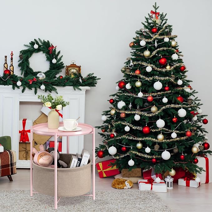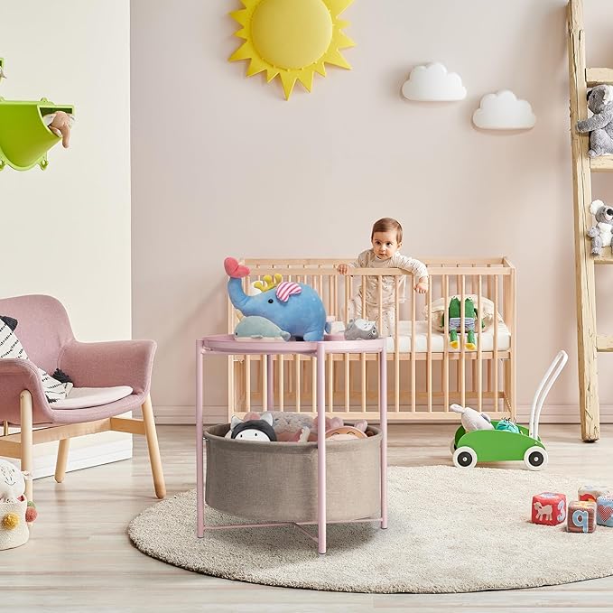 danpinera Round Side Table with Fabric Storage Basket, Metal Side Table Small Bedside Nightstand with Removable Tray Top for Living Room, Bedroom, Nursery, Laundry, Light Pink