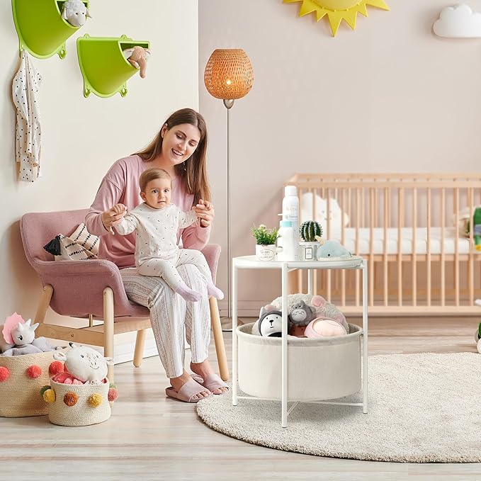 danpinera Round Side Table with Fabric Storage Basket, Metal Side Table Small Bedside Nightstand with Removable Tray Top for Living Room, Bedroom, Nursery, Laundry, White