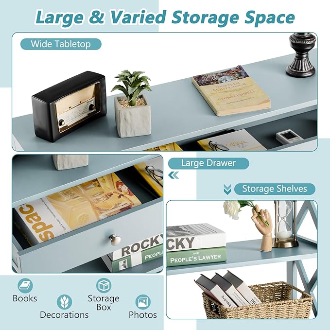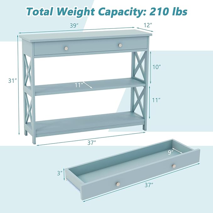 • [Sufficient Storage Space]: Measuring 39” x 12” (L x W) in size, this spacious tabletop can accommodate different belongings, such as photo frame, souvenir and other decorations. And the large drawer can store your key and wallets with ease. Besides, the 2 storage shelves can provide you with extra storage for boxes or shoes.