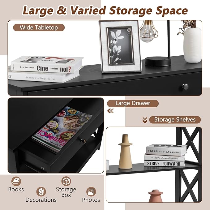 • [Sufficient Storage Space]: Measuring 39” x 12” (L x W) in size, this spacious tabletop can accommodate different belongings, such as photo frame, souvenir and other decorations. And the large drawer can store your key and wallets with ease. Besides, the 2 storage shelves can provide you with extra storage for boxes or shoes.