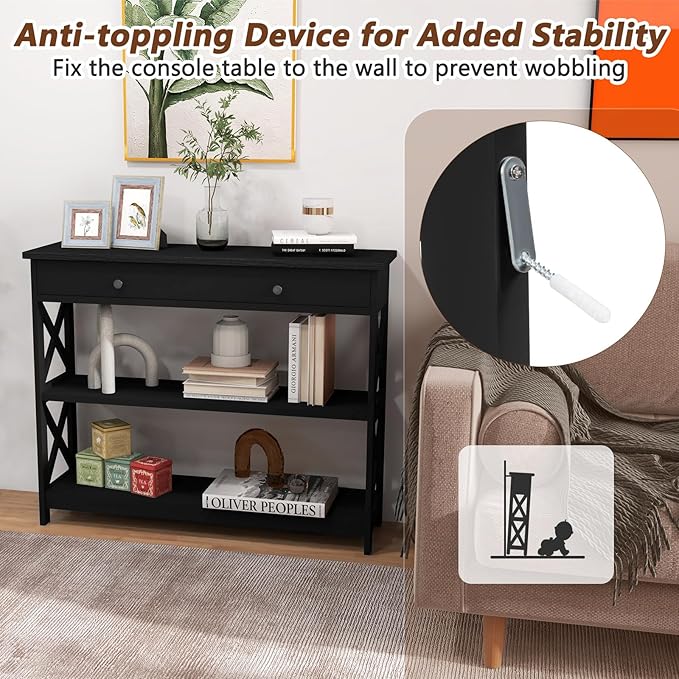 GOFLAME 39" Console Sofa Table with Drawers, 3-Tier Narrow Entry Table with Storage Shelves for Living Room Behind Couch, Entryway, Hallway (Black)