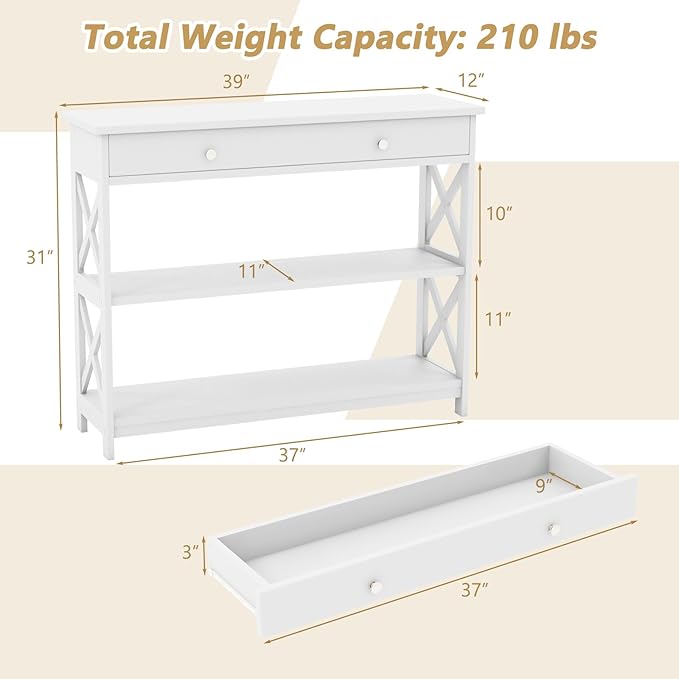 • [Sufficient Storage Space]: Measuring 39” x 12” (L x W) in size, this spacious tabletop can accommodate different belongings, such as photo frame, souvenir and other decorations. And the large drawer can store your key and wallets with ease. Besides, the 2 storage shelves can provide you with extra storage for boxes or shoes.