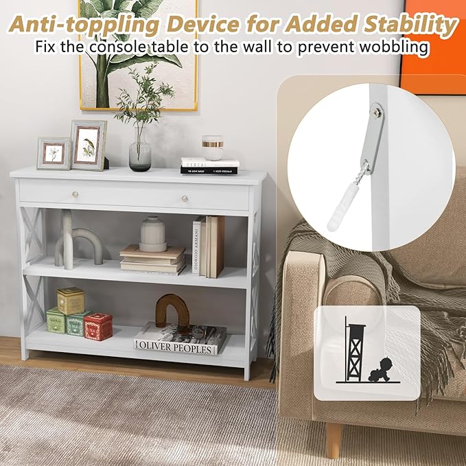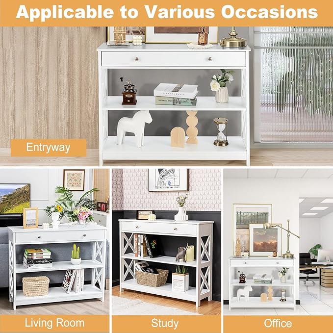 • [Sturdy & Durable Structure]: Made of solid MDF with odorless painting finish, this 3-tier hallway table stands the test of time and comes with strong loading capacity up to 209 lbs in total. And the X-shape structure on both sides provides extra strong stability to prevent wobble.