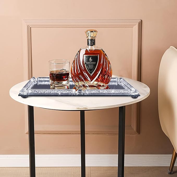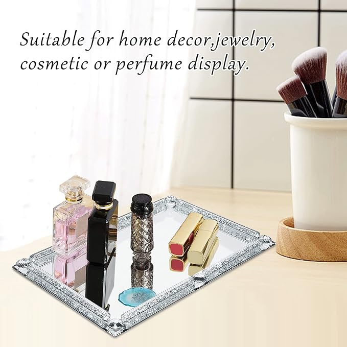 • [Excellent Material] - This perfume tray is made of crystal glass material,rectangle shape fill with crushed diamond for four sides.The surface of the tray is mirror that looks smoothly and brightly.On the bottom there are four anti-slip rubbers,it helps you to prevent from scratching the surface of the table that you place on.