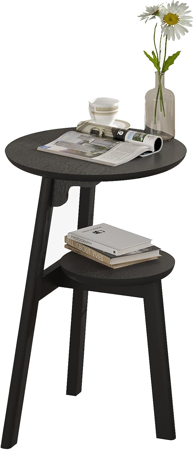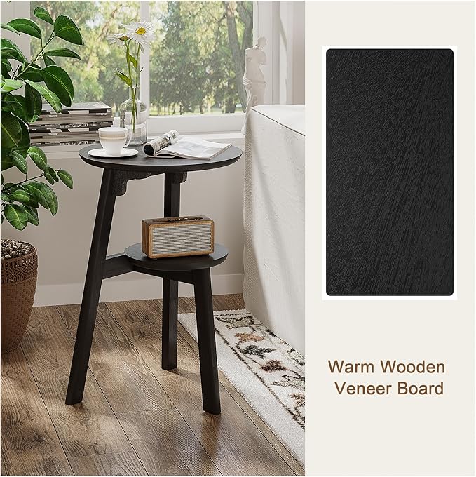 ChooChoo Round End Table for Small Spaces, Narrow Side Table, Accent Table Night Stand with 2 Tier Shelf for Bedroom and Living Room, Black