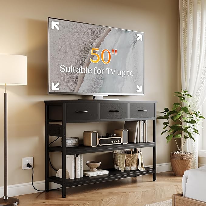 Lulive Entryway Table with Power Outlets, Console Table with 3 Fabric Drawers, Sofa Table for Living Room, Hallway, Couch, Foyer, Height Adjustable (Black, 43")