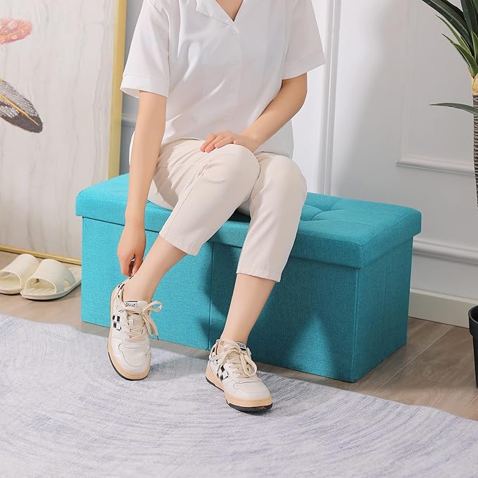 CUYOCA Storage Ottoman Bench Foldable Seat Footrest Shoe Bench End of Bed Storage with Flipping Lid, 75L Storage Space, 30 inches Linen Fabric Teal Blue