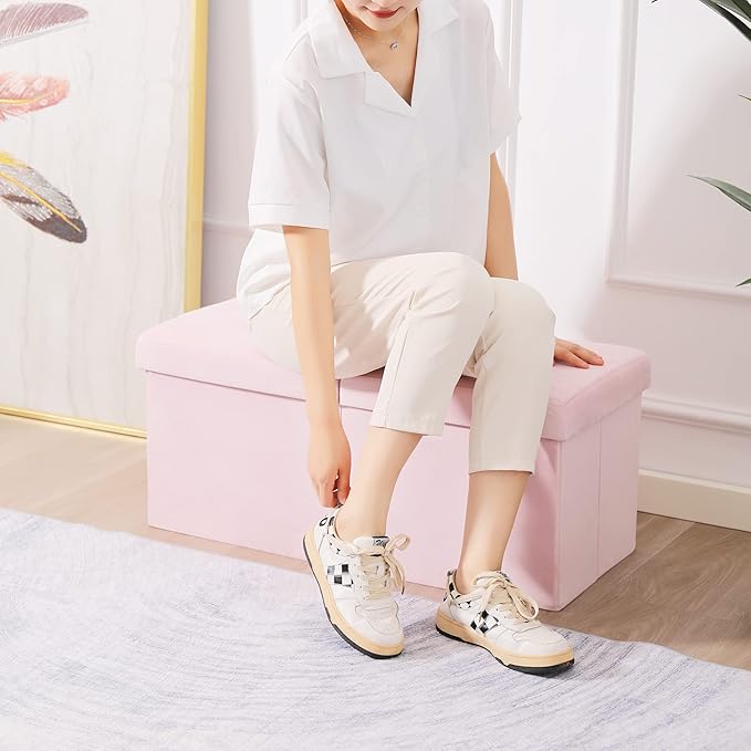 CUYOCA Storage Ottoman Bench Foldable Seat Footrest Shoe Bench End of Bed Storage with Flipping Lid, 75L Storage Space, 30 inches Velvet Pink