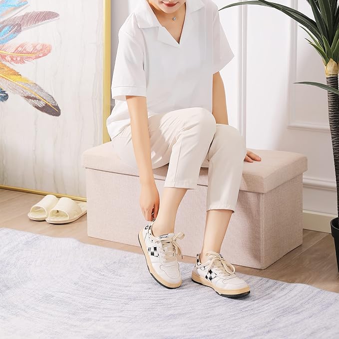 Cuyoca Foldable Seat Footrest Shoe Bench End of Bed Storage with Flipping Lid, 75L Storage Space, 30 inches Linen Fabric Beige
