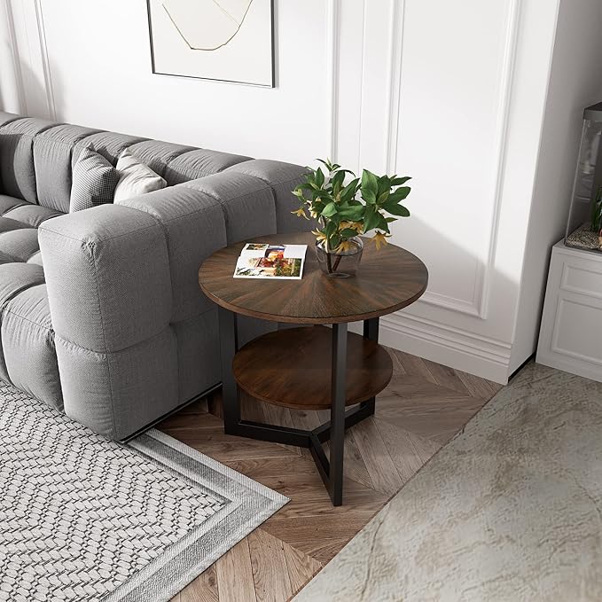 • Modern Minimalist Chic: This large round end table combines a circular, umbrella-patterned tabletop with a triangular iron frame structure, featuring a two-tone design of rustic brown and black. Its modern, minimalist aesthetic complements various home styles and sofa shapes, adding a relaxed ambiance to your living room.