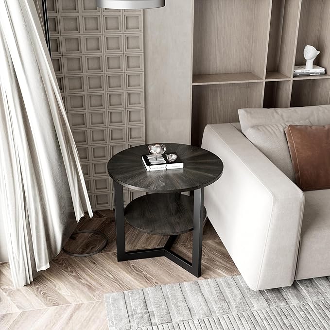 • Modern Minimalist Chic: This large round end table combines a circular, umbrella-patterned tabletop with a triangular iron frame structure, featuring a two-tone design of rustic black and black. Its modern, minimalist aesthetic complements various home styles and sofa shapes, adding a relaxed ambiance to your living room.
