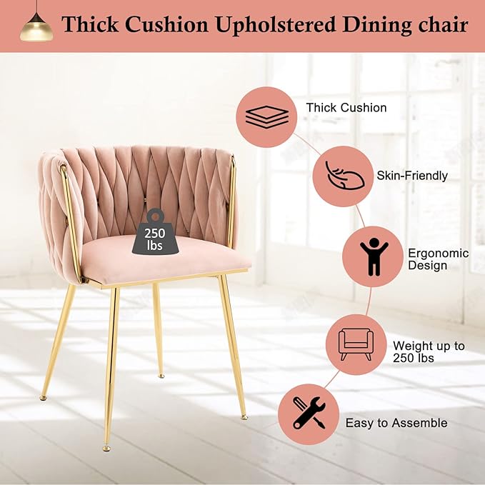 NIOIIKIT Modern Velvet Dining Chairs Hand Weaving Accent Chairs Living Room Chairs Upholstered Side Chair with Golden Metal Legs for Dining Room Kitchen Vanity Living Room (Pink)