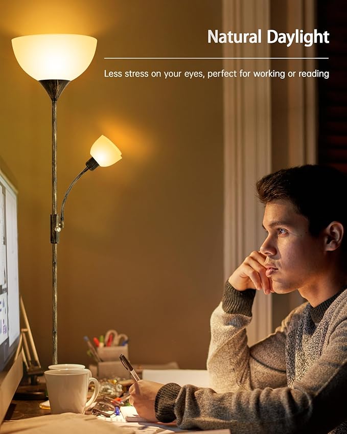 • 【Decorative Floor Lamp with 2 heads】With the unique bronze finish design, BoostArea 12W torchiere floor lamp comes with a 4W flexible side reading light, the gooseneck allows you to adjust angles to illuminate your projects, like reading, working or daily use; Emitting 2700K warm white light, the Eye-caring floor standing lamp will not harm your eyes; Also, with the 3-way rotary switch, you can choose seperate lights or both ON/OFF according to different needs