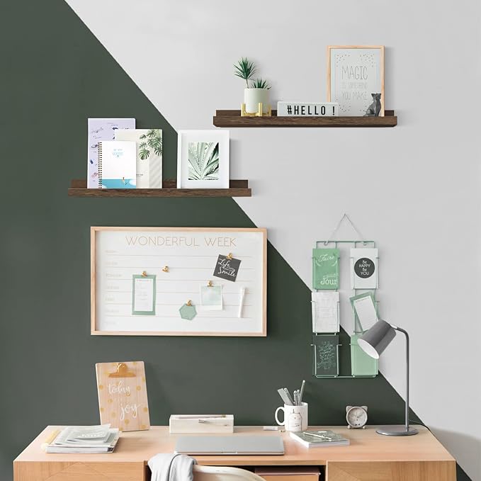 • 【Perfect solution for your walls】The picture ledge wall shelf is SAME SIZE as each other (L 23.1" x D 4.5" x H 2.2") and is such an easy way to display photos without making lots of holes in your walls. The wall shelves are crafted from Paulownia wood which are lightweight yet proportionately strong, sustainable real wood. They come fully assembled and all mounting hardware is included in the package.