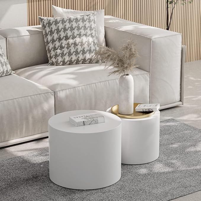 • ✨Durable & Sturdy. Modern nesting tables set of 2 is made of MDF material and can hold up to 110 lbs. The high quality material and and multiple polishing processes gives it a smooth surface which is waterproof, wear-resistant and easy to clean. The round design of the coffee table makes it evenly stressed in use, more firm and stable, not easily deformed.