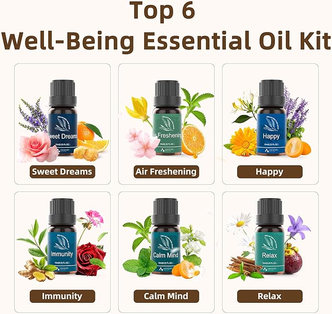 • [Globally Sourced Materials] Introduce the long-lasting, pleasant, and relaxing aroma to your home with our Well-being aromatherapy diffuser oils set! Happy, Calm Mind, Air Freshening, Relax, Immunity, and Sweet Dreams inclued for your well-being and happy life . The scent of plants is effectively preserved using the low boiling point extraction procedure. No carriers, alcohol, or animal testing are used in any of our essential oils