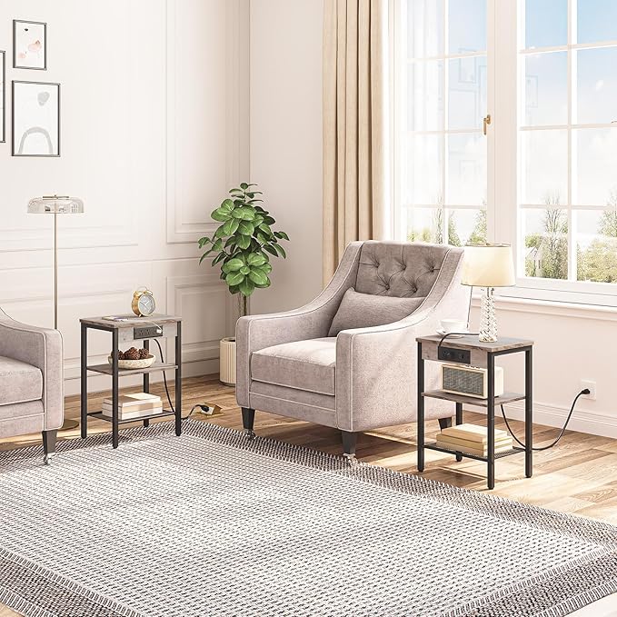 HOOBRO End Tables Set of 2 with Charging Station and USB Port, 3-Tier Nightstands with Adjustable Shelves, Small Side Tables for Small Space in Living Room, Bedroom and Balcony, Greige BG112BZP201