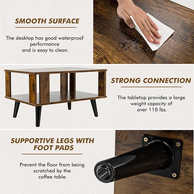 • Wood Structure & Smooth Tabletop: Made of high quality panels, our coffee table has a stable construction. The table top can withstand 110 pounds while the storage has a weight capacity of 44 lbs. Moreover, finer craftsmanship also provides a smooth, waterproof surface, which can be easily cleaned by a wet towel.