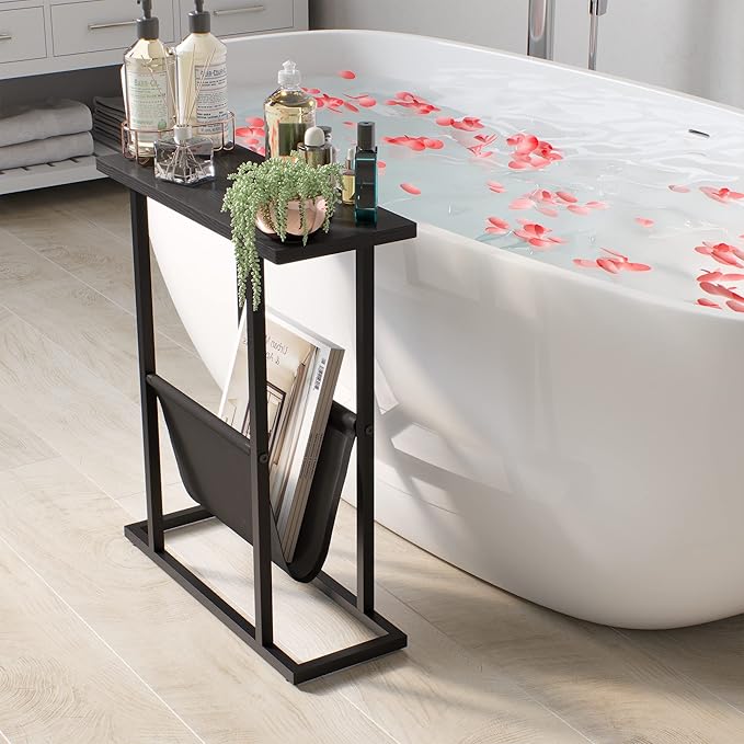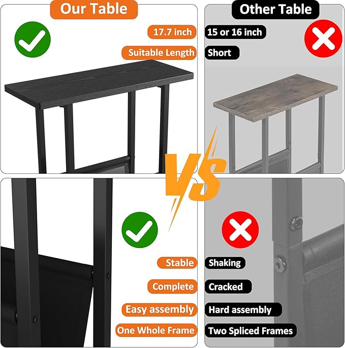 • Small Narrow End Table: This different side table was made of MDF board + black matte paint metal feet + cloth bag + adjustable foot pad, and it is perfect for small or narrow space.