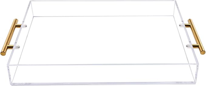 12"x16" Clear Acrylic Serving Tray with Golden Handles, Sturdy Huge Capacity Acrylic Tray for Coffee, Juice, Kitchen and Desk Organizer, Storage Tray (12"x16")